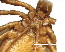 En partant de l'hypothèse non vérifiée que seules les femelles sont hématophages, et suivant la clé de FdeF 1937 (!), j'arriverai bien à Ixodes avec un sillon anal ouvert vers l'arrière ... après ... Je ne vois pas de forte épine interne à la hanche 1, et je lui vois une tête triangulaire ...