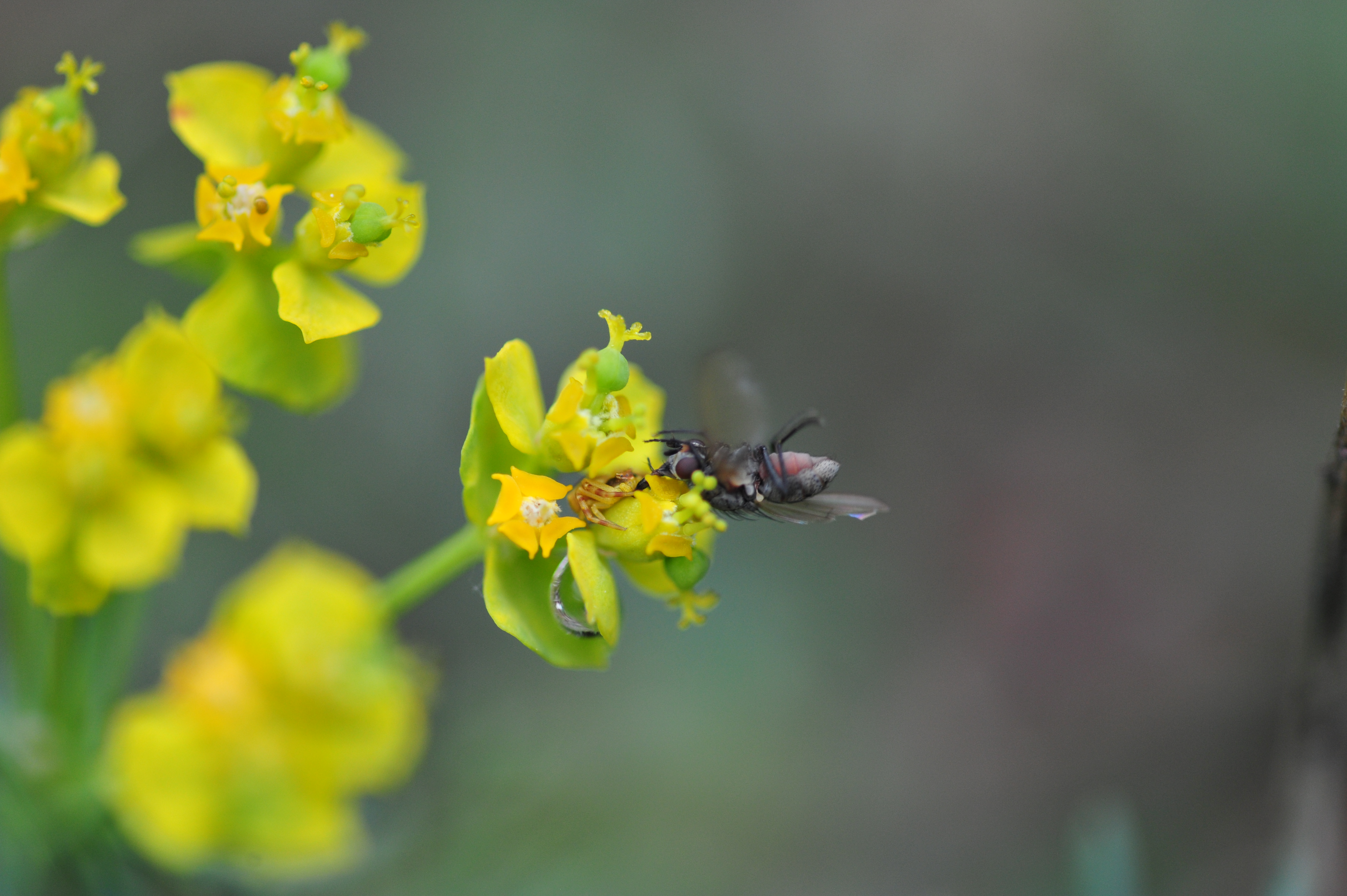 Il s'agit d'une capture particulièrement mouvementée d'une "mouche à merde" Scatophaga stercoraria par une thomise Thomisus onata ? car l'araignée a attrapé la mouche par l'extrémité de la trompe et cette dernière s'est très fortement débattue dans tous les sens avant de succomber peu à peu à l'effet du venin.